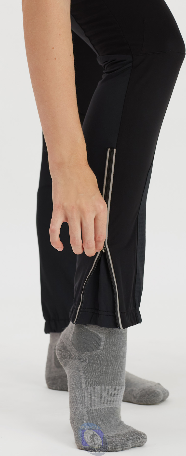 Tył zrobiony jest z miękkiego, ciepłego i dobrze odprowadzającego wilgoć materiału. Wszystko to ułatwia ruch przy zachowaniu optymalnego komfortu termicznego. Spodnie posiadają silikonowe taśmy zapobiegające niekontrolowanemu przesuwaniu się. Nogawki wyposażone są w rozpinające się do wysokości kolan suwaki umożliwiające zakładanie spodni np. do skitourowych butów.